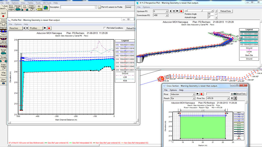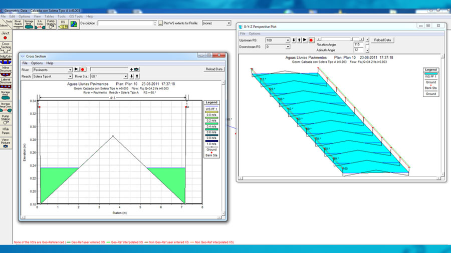 - Estudios de crecidas en cauces asociados a riesgos de inundaciones y anegamientos, incluyendo crecidas centenarias y análisis del eje hidráulico del cauce mediante software unidimensional o bidimensional (Hec-Ras 2D, Iber 2.3.2).